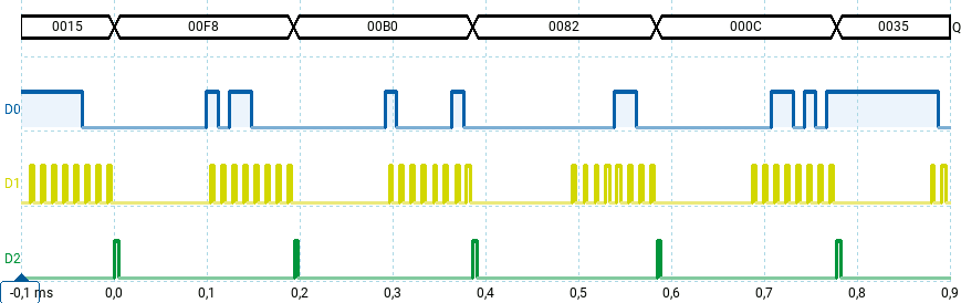 Osservazione ovvia: l'oscilloscopio utilizzato non dispone di tre canali per osservare contemporaneamente tutti questi segnali... Per questo utilizzeremo tre ingressi digitali dell'analizzatore di stati logici (da D0 a D15, i fili gialli nell'immagine di apertura).