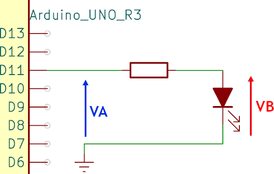 Le due tensioni misurate dai due canali possono essere indicate sullo schema nel modo seguente, dove VA è la tensione generata da Arduino e VB è la tensione ai capi del LED.