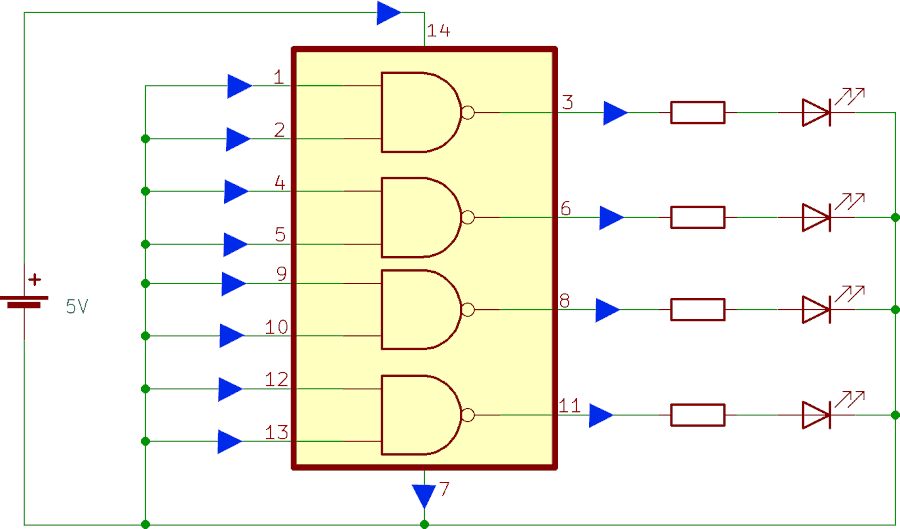 Il circuito integrato 74HC00 contiene quattro porte logiche NAND a due ingressi. Complessivamente ha 14 piedini, numerati da 1 a 14. Nello schema seguente è evidenziato dal rettangolo giallo; le frecce blu indicano il verso delle correnti: entrante per I14 perché collegato ad un generatore, arbitrario per i rimanenti 13 pin.