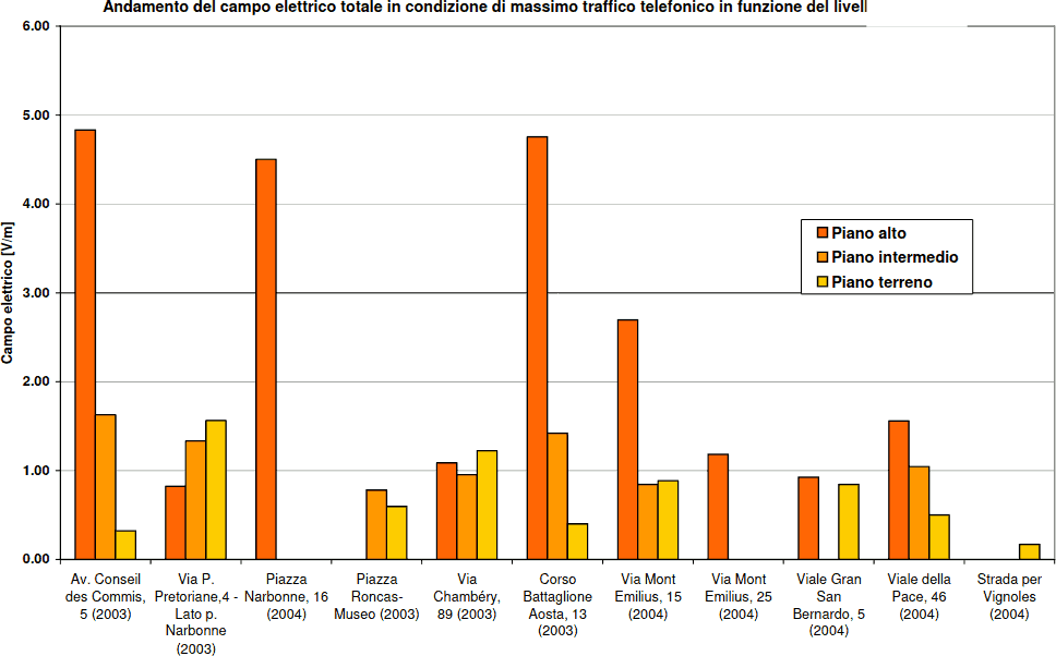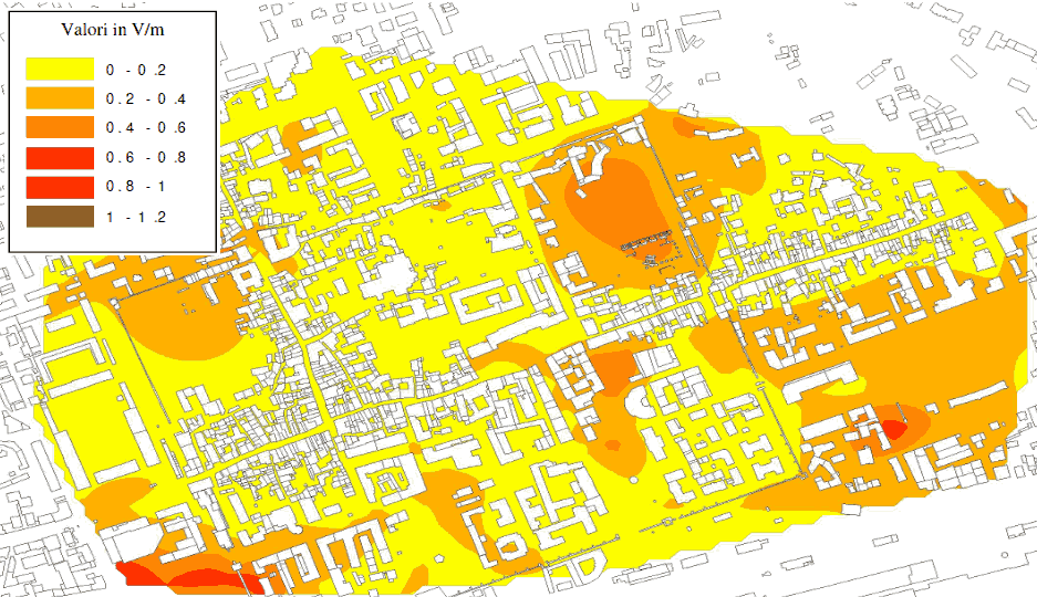 Di seguito una mappa relativa al centro di Aosta che mostra come, al suolo, i valori di E siano abbondantemente inferiori a 6 V/m previsti come massimo dalla normativa dell'epoca.