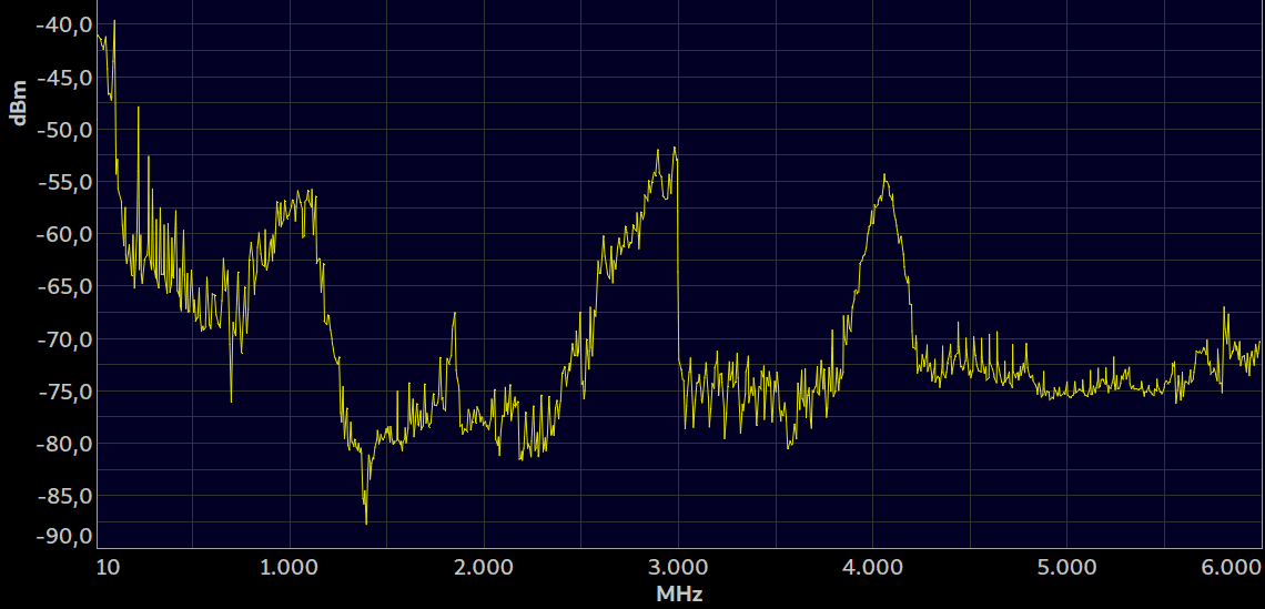 Il seguente grafico mostra il segnale ricevuto da un analizzatore di spettro Aaronia SPECTRAN HF-6065 dotato di antenna OmniaLOF90200 (nota 14); le frequenze vanno da 10 MHz a 6 GHz. Il luogo è il laboratorio di telecomunicazioni della mia scuola, durante una normale giornata di lezione.