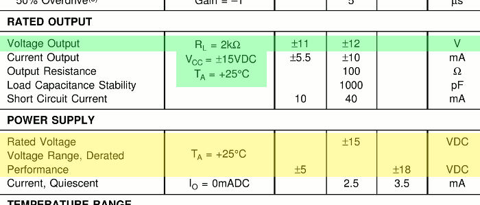 Il costruttore fornisce i valori minimi e massimi delle tensioni di alimentazioni, nell'esempio sotto riportato comprese in modulo tra 5V e 18V, prima e terza colonna numerica, in giallo; ± 15V è il valore consigliato (valore tipico, colonna centrale). Tali tensioni sono spesso indicate con il termine rail (letteralmente binario, sebbene questo termine non è usato in italiano).