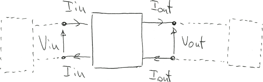 Normalmente è disegnato con un rettangolo vuoto, come nella figura di apertura; sono messe in evidenza le tensioni e le correnti di ingresso (Vin e Iin, a sinistra) e di uscita (Vout e Iout, a destra; nota 6). Esse dipendono sia dalle caratteristiche del quadripolo che dai circuiti collegati all'ingresso e all'uscita, in figura tratteggiati (nota 1).