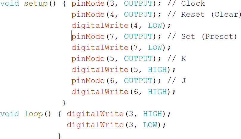 Il codice di Arduino deve pilotare tutti gli ingressi del Flip Flop. Possiamo, per esempio, decidere di: