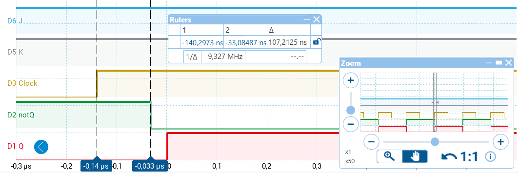 Utilizzando lo Zoom ("rotella" del mouse) misurare il tempo di propagazione tra il fronte attivo del Clock ed il fronte di Q.