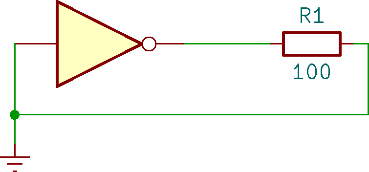 Realizzare il seguente, semplicissimo, circuito. Invece di un inverter può essere utilizzata una qualunque porta logica, purché l'uscita sia alta. Prima di proseguire è utile leggere quanto presentato nell'esempio 5.