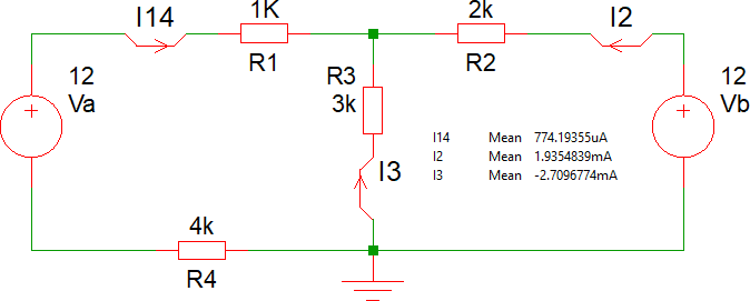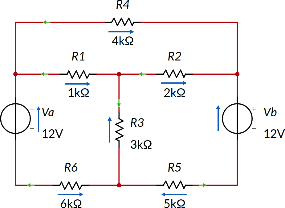 I nomi utilizzati per tensioni e correnti sono ovviamente arbitrari, ma conviene sceglierli facendo riferimento al nome dei componenti. Per esempio useremo per questo esempio I14, I2 ed I3 per le correnti (dal nome dei resistori attraversati dalla corrente, nota 6), V1, V2, V3, V4, Va e Vb per le tensioni (dal nome del componente ai capi del quale la tensione è misurata).