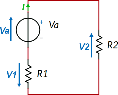 Possiamo scrivere l'equazione all'unica maglia. Occorre individuare un percorso, partendo da un punto arbitrario; muovendosi in un verso anch'esso arbitrario si sommano le tensioni incontrate se concordi al verso di percorrenza, si sottraggono se discordi. In questo esempio si è scelto come punto di partenza quello intermedio tra R1 e Va e come verso di percorrenza quello orario (nota 1):