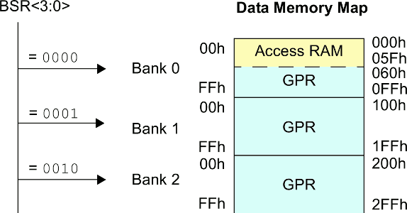 Per utilizzare tutte le celle di memoria occorre utilizzare l'indirizzamento diretto di tipo Banked ed il registro speciale BSR. Questo registro di quattro bit contiene il numero del banco che un'istruzione deve utilizzare; in pratica è la prima cifra esadecimale dell'indirizzo. Per esempio il registro 0x56 del banco 0x3 è indicata come registro 0x356; il registro BSR contiene 3.