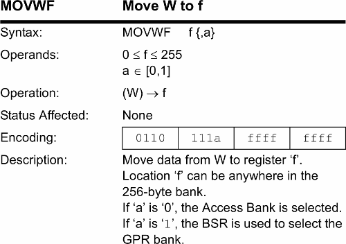 Il secondo argomento dell'istruzione {,a} specifica se deve essere usato l'Access Bank (quando a=0) oppure un altro banco (quando a=1), scelto attraverso il registro BSR. Questo argomento è facoltativo, come indicato dall'uso delle parentesi graffe {} .