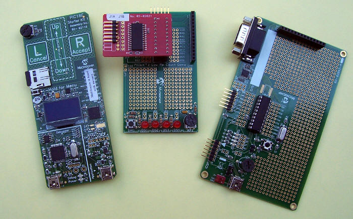 Personalmente ho utilizzato per i PIC18 diversi starter kit. Da sinistra: