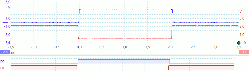 Di seguito quanto visibile sullo schermo di un Picoscope; in blu l'uscita digitale della porta, in rosso l'ingresso: