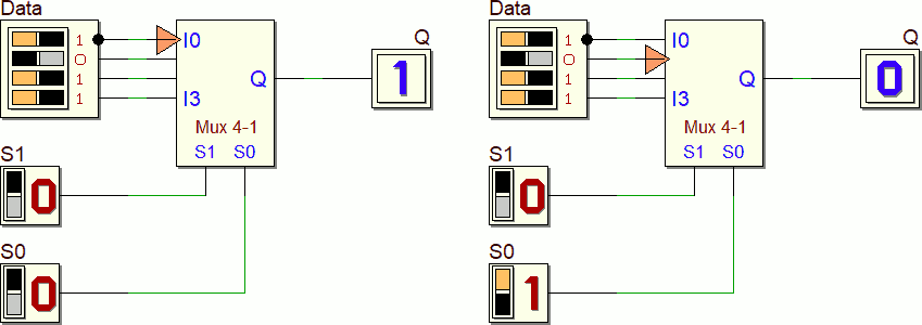 Per esempio, se gli ingressi di selezione valgono S1=1 e S0=0, corrispondenti al numero binario 10, cioè 2 (attenzione all'ordine!), l'uscita sarà pari al valore binario presente all'ingresso I2.