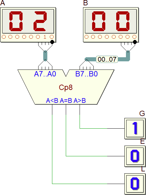 Un comparatore permette, dati due numeri binari in ingresso, di determinare se il primo è maggiore, uguale o minore del secondo. Di seguito un esempio di confronto tra due i numeri a 8 bit A e B: