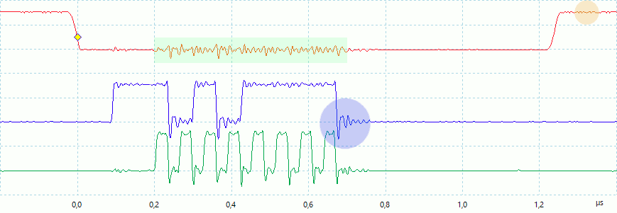 L'immagine seguente mostra un esempio di misura del tempo di discesa di un segnale reale. I livelli di tensione per il livello logico logico alto e basso sono rispettivamente: