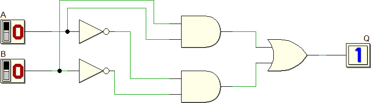 Vogliamo realizzare un circuito combinatorio con due ingressi digitali A e B ed un'uscita Q. Q è alta quando entrambi gli ingressi sono uguali, bassa in caso contrario.