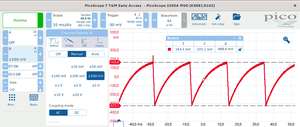 Il segnale collegato al canale B appare molto piccolo, al limite della leggibilità (nota 7). Il tentativo di modificare l'attenuatore di ingresso porta a volte a situazioni di superamento della tensione misurabile (overrange), identificato da un punto esclamativo bianco su fondo rosso: