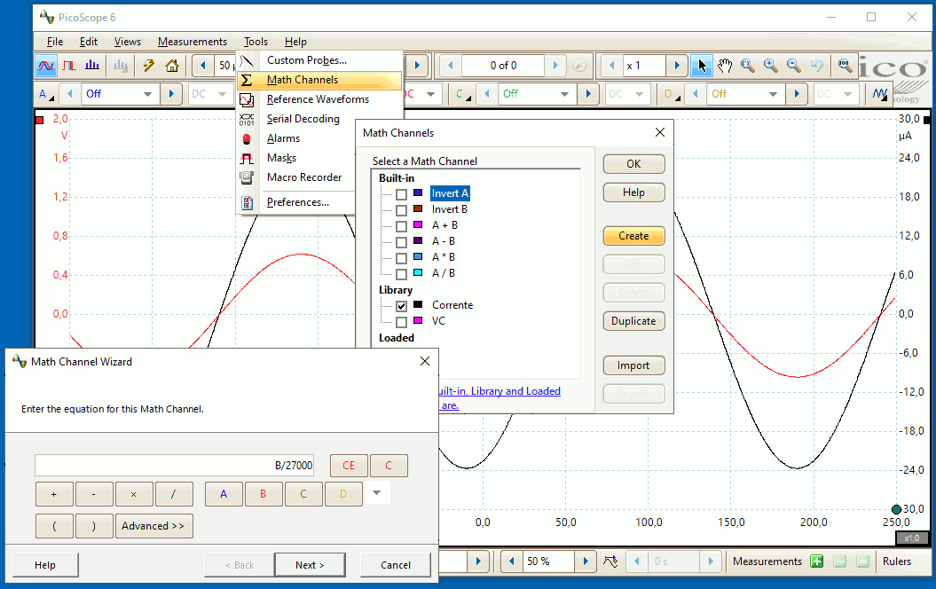 La corrente in R1 (e quindi in tutto il circuito) è facilmente calcolabile conoscendo la tensione ai capi di R1: basta applicare la legge di Ohm. Utilizzando il software Pico Technology è possibile automatizzare ciò scrivendo la formula corrispondente negli strumenti matematici:
