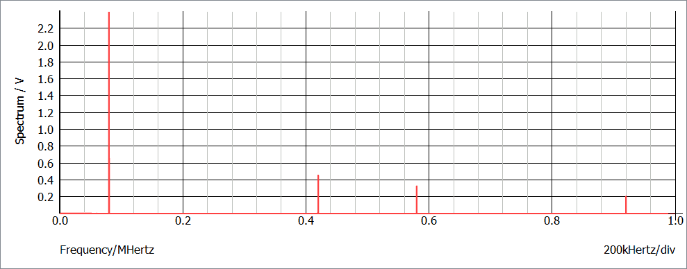 Anche lo spettro del segnale ricostruito appare diverso: si osservano infatti linee spettrali non presenti nel segnale analogico e con frequenza pari a 420 kHz, 580 kHz, 920 kHz ed altre non mostrate nel grafico seguente: