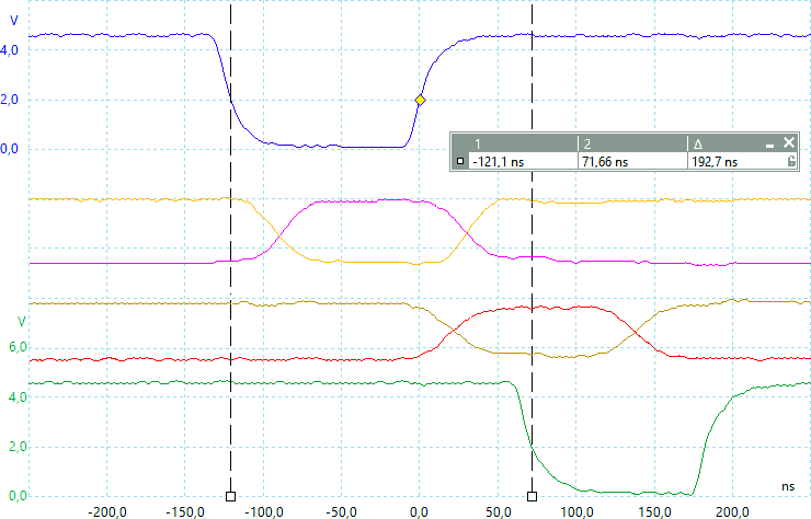 I cursori mettono in evidenza un tempo di propagazione di quasi 195 ns, somma del tempo di propagazione del trasmettitore, del ricevitore (già visti poco sopra) e della linea di trasmissione.