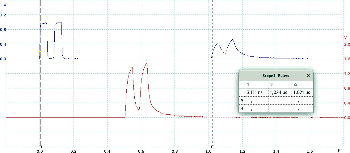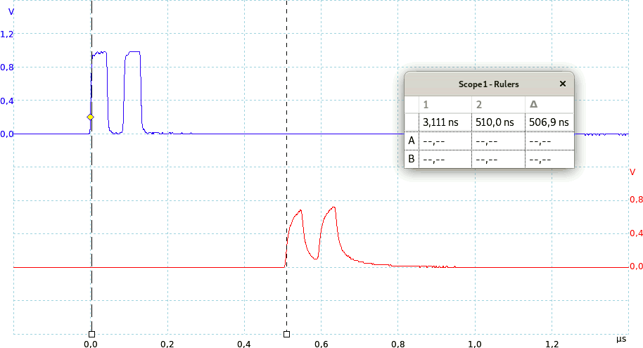 L'immagine seguente mostra un doppio impulso trasmesso dal generatore di impulsi (in blu) ed il segnale ricevuto al termine di un cavo lungo circa 100 m e correttamente terminato (in rosso); il tempo impiegato dal segnale è di poco più di 500 ns.