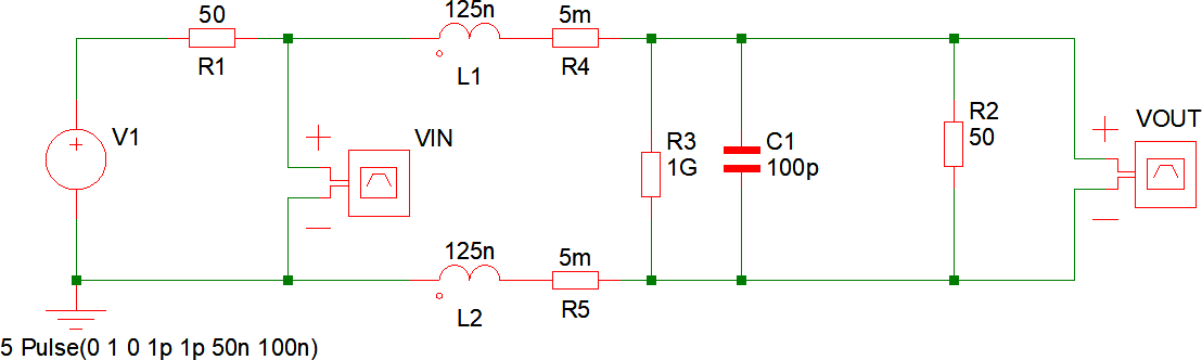 All'ingresso della linea è presente un generatore di impulsi con resistenza pari nell'esempio a 50 Ω; in uscita è presente un carico costituito da R2, anch'essa da 50 Ω. Il valore di R1 ed R2 deve essere uguale e scelto opportunamente, in base al tipo di linea in uso.