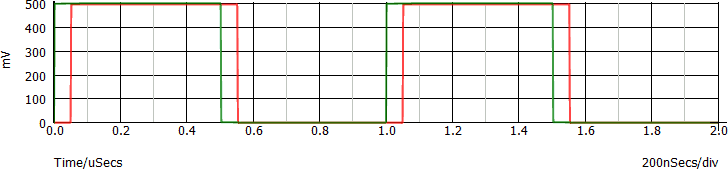 La risposta all'impulso è mostrata nel grafico seguente, dove in verde è rappresentato l'ingresso ed in rosso l'uscita: