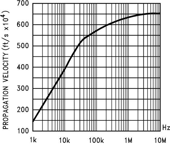 Dal grafico di vede che la velocità di propagazione aumenta con la frequenza del segnale, fino a giungere al valore di 650 ft/s·106(!), circa 1,98·108 m/s, circa 0,66·c. Tale valore è molto simile per molti tipi di linee di trasmissione.