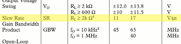 Il valore dello slew rate è in genere fornito dal produttore dell'amplificatore operazionale e non dipende (in prima approssimazione) della configurazione utilizzata, dal guadagno o dalla forma del segnale di ingresso. Nell'esempio che segue, si può leggere che la tensione di uscita può variare (tipicamente, seconda colonna) fino ad un massimo di 17 volt in un microsecondo.