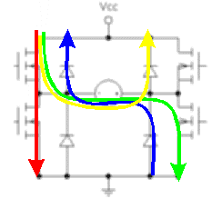 A seconda di quali transistor sono in attivi, abbiamo diversi possibili percorsi per la corrente, illustrati nell'immagine sopra riportata: