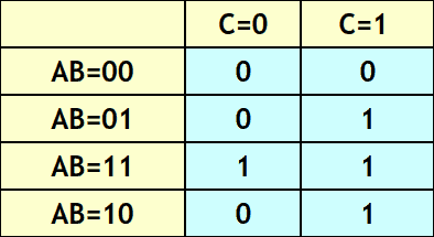 Costruiamo la K-map, formata da 8 celle disposte 4x2, ponendo le combinazioni A e B sulle righe e C sulle colonne (nota 3):