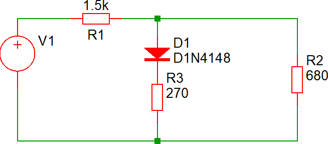 Nel seguente circuito è nota la tensione del generatore V1 (5 V) e la tensione ai capi di R2 (0,717 V, con potenziale positivo in alto). Determinare la corrente nel diodo D1 e la tensione ai suoi capi.
