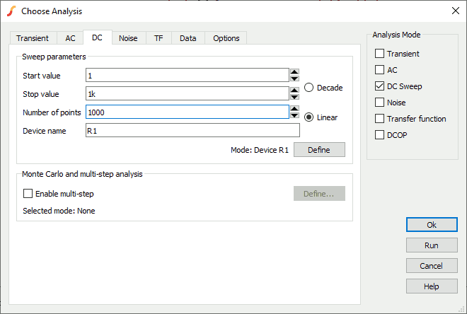 Occorre impostare la modalità DC sweep, il dispositivo che deve essere modificato (R1), i valori minimo e massimo, il numero di passaggi da effettuare.