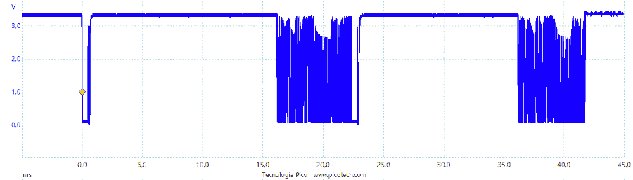 Il grafico mostra la lettura di un valore di temperatura da uno dei sensori: sono chiaramentemvisibili le fasi di comando inviato da Rpi e di risposta, inviata dallo slave. La durata complessiva della comunicazione è poco più di 40 ms; il tempo della sola trasmissione dell'ordine dei 6 ms, altrettanti quella della sola ricezione: devono essere infatti sempre essere trasmessi i 64 bit del ROM-ID. Si noti la diminuzione della tensione di alimentazione durante la trasmissione, causata dalla scarica della tensione del condensatore interno allo slave.