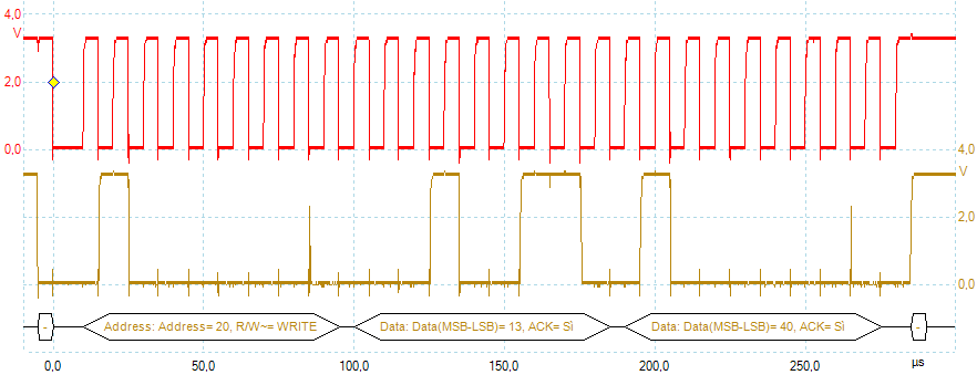 La figura seguente mostra lo stato di SDA (in color ocra) e SCL (in rosso) durante la scrittura del byte 0x40 nel registro 0x13 del dispositivo con indirizzo 0x20.
